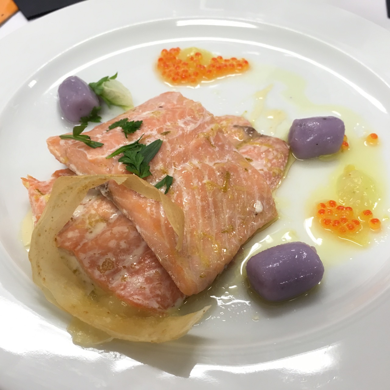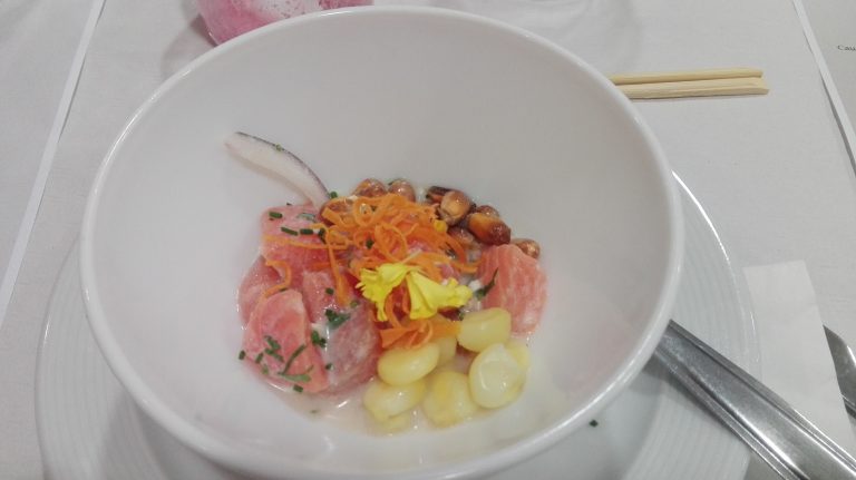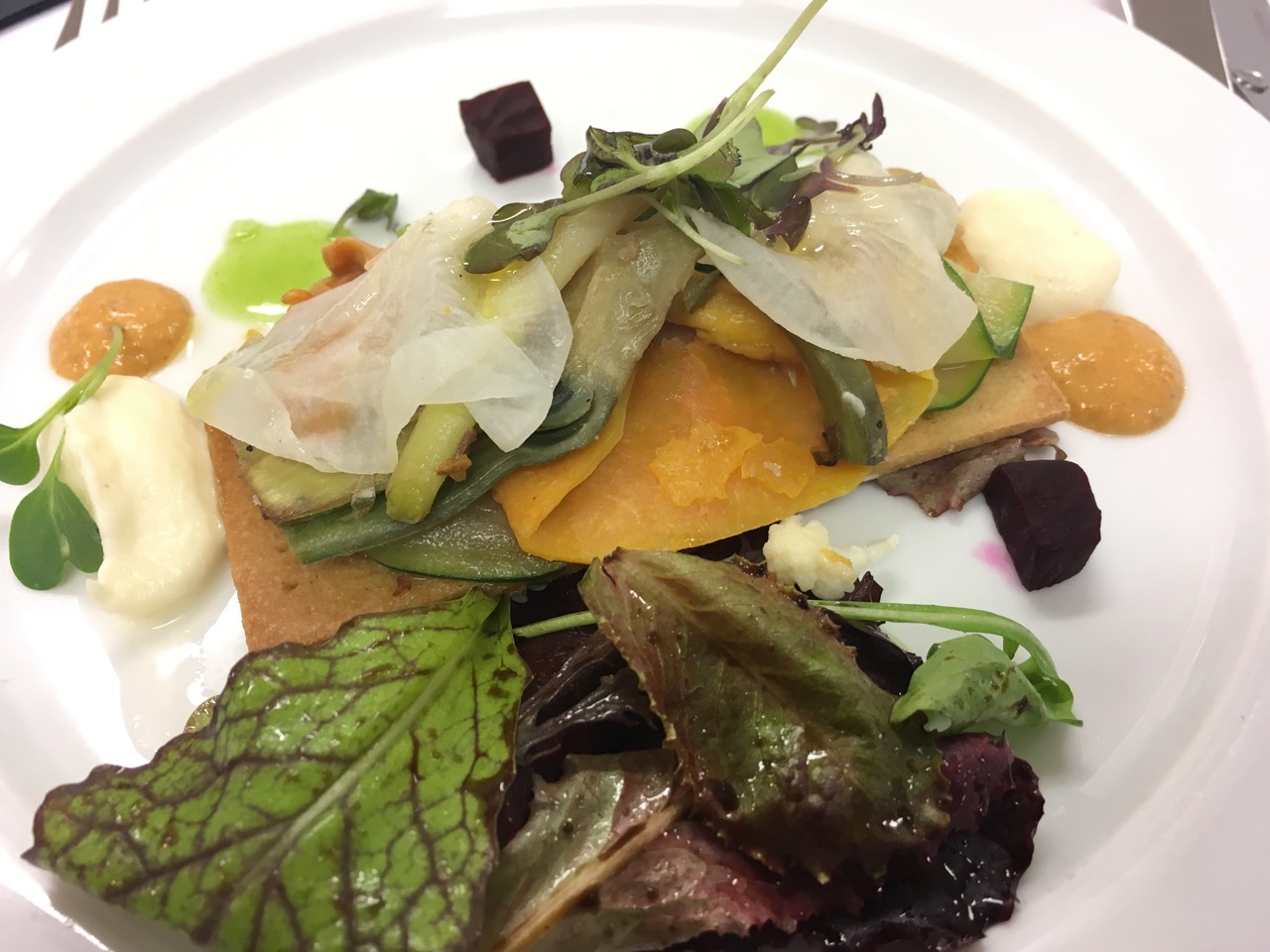 Vam arrencar el sopar a les 21:45 amb un ambient de trobada propera i molta gana. Van obrir foc uns mossets vistosos —un ou farcit de mousse de tonyina i una cullereta de bacallà amb mango— seguits d’una lassanya gratinada amb bolets i verdures.
